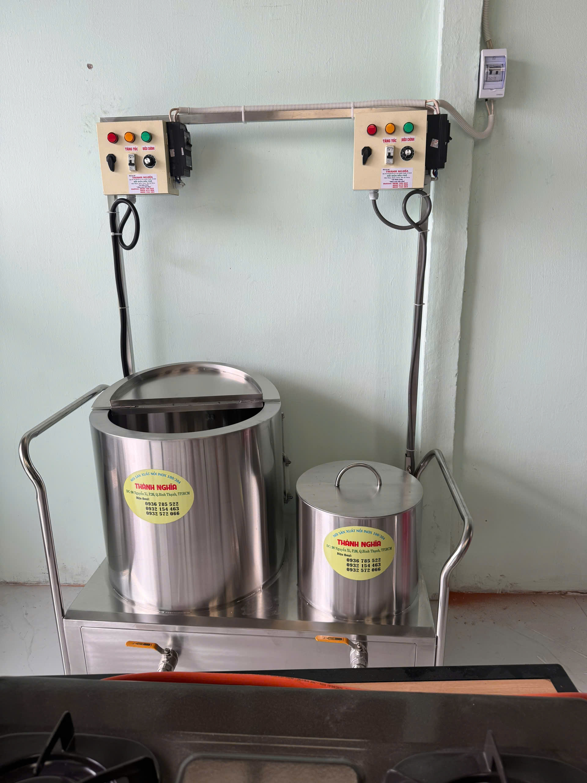 - Em Quân Xin Giới Thiệu Mẫu Nồi Điện Nấu 80L 3 Lớp Và Nồi 20L 2 Lớp Được Làm Trên Một Má Đế . Có Cả Bánh Xe , Tay Đẩy , Bảng Hộp Điện Kèm Theo Luôn . Dùng Ninh Xương , Rau Củ Quả Hâm Nóng Nước Lèo Nấu Thơm Ngon Để Nấu Những Món Hủ Tiếu , Phở , Bún Mọc , ... Đun Sôi Một Cách Nhanh Chóng Tiện Lợi , Sử Dụng Gọn Gàng . Tiết Kiệm Thời Gian Nấu , Thay Thế Cho Những Nồi Nhôm Và Cách Nấu Truyền Thống : Than Đá , Bếp Gas. Cấu Tạo Nồi Tất Cả Inox 304 Chống Rỉ Sét , Đảm Bảo An Toàn Thực Phẩm Khi Nấu . Bên Trong Thân Nồi Sử Dụng Foam Cách Nhiệt . Điều Chỉnh Nhiệt Độ Theo Yêu Thích , Tủ Điện Rời Theo Mỗi Nồi Đun Sôi Một Cách Nhanh Chóng Tiện Lợi , Bền Bỉ - Uy Tín - Chất Lượng Là Danh Dự Luôn Đặt Lên Hàng Đầu . Sử Dụng Điện 1 Pha 220v Bảo Hành Nguồn Điện 1 Năm . Nhận Đặt Làm Nồi Kích Thước Theo Yêu Cầu Của Quý Khách SĐT : ( 0932572066 - 0936785522 Anh Nghĩa ) ( 0932154463 Chị Lệ ) ( 0706787636 Em Quân )( Đều Có Zalo ) Địa Chỉ Cửa Hàng 1 : 115 Nguyễn Xí , Phường 26 , Quận Bình Thạnh. Địa Chỉ Cửa Hàng 2 : Châu Thành , Tiền Giang ( Ngay Cầu Bến Chùa ). Địa Chỉ Xưởng : 193 Quốc Lộ 13 , P.Hiệp Bình Chánh , Thủ Đức.